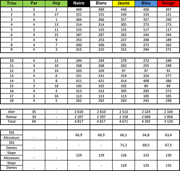 Le parcours est un PAR 69 d’une longueur de 4817 mètres pour un départ des boules noires.Une longueur de 4817 mètres pour le départ messieurs (boules blanches) et une longueur de 4392 mètres pour le départ femme (boules bleues).Il est composé de 5 PAR 3, 11 PAR 4 et 2 PAR 5.Le slope messieurs du parcours est de 129.Le slope femmes du parcours est de 125.Ce parcours peut être considéré de difficulté normale.